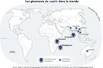 The Logan sapphire, the Star of India, the Star of Adam and the Star of Bombay originate from Sri Lankan mines. Madagascar is the world leader in sapphire production (as of 2007) specifically its deposits in and around the town of Ilakaka.[31] Prior to the opening of the Ilakaka mines, Australia was the largest producer of sapphires (such as in 1987).[32] In 1991 a new source of sapphires was discovered in Andranondambo, southern Madagascar. The exploitation started in 1993, but was practically abandoned just a few years later because of the difficulties in recovering sapphires in their bedrock.[33]