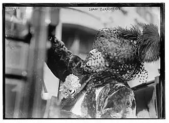 Following this success, she acted in several revivals and classics, and many French writers offered her new plays. In 1887, she acted in a stage version of the controversial drama Thérèse Raquin by Emile Zola. Zola had previously been attacked due to the book's confronting content. Asked why she chose this play, she declared to reporters, "My true country is the free air, and my vocation is art without constraints."[100] The play was unsuccessful; it ran for just 38 performances.[104] She then performed another traditional melodrama, Francillon by Alexandre Dumas fils in 1888. A short drama she wrote herself, L'Aveu, disappointed both critics and the audience and lasted only 12 performances. She had considerably more success with Jeanne d'Arc by the poet Jules Barbier, in which the 45-year-old actress played Joan of Arc, a 19-year-old martyr.[105] Barbier had previously written the librettos for some of the more famous French operas of the period, including Faust by Charles Gounod and The Tales of Hoffmann by Jacques Offenbach. Her next success was another melodrama by Sardou and Moreau, Cleopatra, which allowed her to wear elaborate costumes and finished with a memorable death scene. For this scene, she kept two live garter snakes, which played the role of the poisonous asp which bites Cleopatra. For realism, she painted the palms of her hands red, though they could hardly be seen from the audience. "I shall see them," she explained. "If I catch sight of my hand, it will be the hand of Cleopatra."[106]