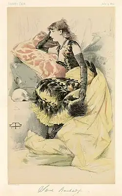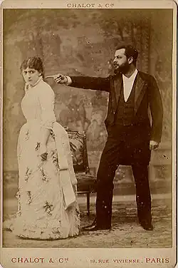 When she returned to Paris, she was offered a new role in Fédora, a melodrama written for her by Victorien Sardou. It opened on 12 December 1882, with her husband Damala as the male lead, and received good reviews. English novelist Maurice Baring, who wrote a biography of Bernhardt, wrote "a secret atmosphere emanated from her, an aroma, an attraction, which was at once exotic and cerebral...She literally hypnotised her audience."[89] Another journalist wrote "She is incomparable...The extreme love, the extreme agony, the extreme suffering."[90] However, the abrupt end of her marriage shortly after the premiere put her back into financial distress. She had leased and refurbished a theatre, the Ambigu, specifically to give her husband leading roles, and made her 18-year-old son Maurice, who had no business experience, the manager. Fédora ran for just 50 performances and lost 400,000 francs. She was forced to give up the Ambigu, and then, in February 1883, to sell her jewellery, her carriages, and her horses at an auction.[91]