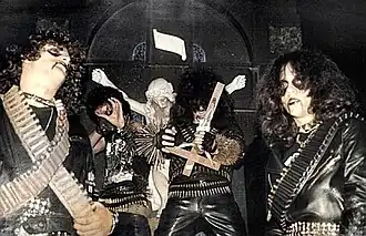 Sarcófago (Portuguese for 'sarcophagus'[5]) was formed in 1985 in Belo Horizonte, Minas Gerais, Brazil.[5] Equally indebted to Finnish hardcore punk and early extreme metal groups such as Bathory, Celtic Frost, and Slayer,[6] Sarcófago's goal was to create the most aggressive music ever.[7] Wagner Lamounier, who parted acrimoniously from Sepultura in March 1985,[8] was invited to join the band.[9] Although Sepultura never recorded anything with Lamounier, he contributed the lyrics to the song "Antichrist" on their Bestial Devastation EP.[10] Sarcófago's vinyl debut was on the Cogumelo Produções split album Warfare Noise I, originally released in 1986. Sarcófago contributed the three tracks "Recrucify", "The Black Vomit" and "Satanas". Their music and lyrics were considered shocking at the time, something which brought them a considerable amount of attention.[11] The band's line-up at that point consisted of "Butcher" (guitars), "Antichrist" (Lamounier; vocals), "Incubus" (Geraldo Minelli; bass) and "Leprous" (Armando Sampaio; drums).[12]