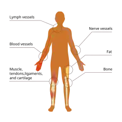 There are many subtypes of sarcoma, which are classified based on the specific tissue and type of cell from which the tumor originates.[6] Common examples of sarcoma include liposarcoma, leiomyosarcoma, and osteosarcoma. Sarcomas are primary connective tissue tumors, meaning that they arise in connective tissues.[2] This is in contrast to secondary (or "metastatic") connective tissue tumors, which occur when a cancer from elsewhere in the body (such as the lungs, breast tissue or prostate) spreads to the connective tissue.[7]
