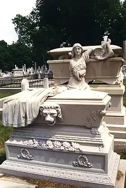 Sarcophagi, usually "false", made a return to the cemeteries of America during the last quarter of the 19th century, at which time, according to a New York company which built sarcophagi, "it was decidedly the most prevalent of all memorials in our cemeteries".[7] They continued to be popular into the 1950s, at which time the popularity of flat memorials (making for easier grounds maintenance) made them obsolete. Nonetheless, a 1952 catalog from the memorial industry still included eight pages of them, broken down into Georgian and Classical detail, a Gothic and Renaissance adaptation, and a Modern variant.[8] The image shows some sarcophagi from the late 19th century located in Laurel Hill Cemetery in Philadelphia, Pennsylvania. The one in the back, the Warner Monument created by Alexander Milne Calder (1879), features the spirit or soul of the deceased being released.