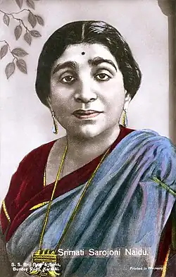 Naidu formed close ties with Gandhi, Gopal Krishna Gokhale, Rabindranath Tagore and Sarala Devi Chaudhurani.[3] After 1917, she joined Gandhi's satyagraha movement of nonviolent resistance against British rule.[3] Naidu went to London in 1919 as a part of the All India Home Rule League as a part of her continued efforts to advocate for independence from British rule.[8] The next year, she participated in the non-cooperation movement in India.[3]