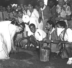 In 1930, Gandhi initially did not want to permit women to join the Salt March, because it would be physically demanding with a high risk of arrest.[3] Naidu and other female activists, including Kamaladevi Chattopadhyay and Khurshed Naoroji, persuaded him otherwise, and joined the march.[3] When Gandhi was arrested on 6 April 1930, he appointed Naidu as the new leader of the campaign.[9]
