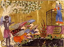Hasan of Basra, an eminent Muslim theologian who lived in the seventh century AD, was quoted as saying: "Iblis was not an angel even for the time of an eye wink. He is the origin of Jinn as Adam is of Mankind."[189] The medieval Persian scholar Abu al-Zamakhshari states that the words angels and jinn are synonyms.[190] Another Persian scholar, al-Baydawi, instead argues that Satan was an angel in essence, but behaved like the jinn.[190][191][192] Abu Mansur al-Maturidi who is revered as the founder of Māturīdiyya Sunni orthodoxy (kalam) argued that since angels can be blessed by God, they are also put to a test and can be punished. Accordingly, Satan became a devil (shaiṭān) or jinn after he refused to obey.[193] The Tarikh Khamis narrates that Satan was a jinn who was admitted into Paradise as a reward for his righteousness and, unlike the angels, was given the choice to obey or disobey God.[194] When he was expelled from Paradise, Satan blamed humanity for his punishment.[195]
