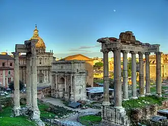 The temple of Saturn was located at the base of the Capitoline Hill, according to a tradition recorded by Varro[17] formerly known as Saturnius Mons, and a row of columns from the last rebuilding of the temple still stands.[6] The temple was consecrated in 497 BC but the area Saturni was built by king Tullus Hostilius as confirmed by archaeological studies conducted by E. Gjerstad.[18] It housed the state treasury (aerarium) throughout Roman history.