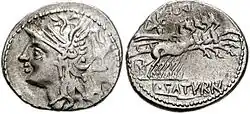 Saturn driving a quadriga on the reverse of a denarius issued by Saturninus