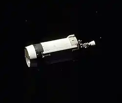 A boilerplate Apollo spacecraft, BP-027 was used for all configurations of dynamic testing.[42] The boilerplate took the place of actual flight hardware. Boilerplate size, shape, mass, and center of gravity were the same, but it was not necessary for the entire Apollo spacecraft to be completed to commence dynamic testing. The boilerplate was outfitted with instrumentation to record data for engineering study and evaluation.[43] BP-27 was accepted at the Marshall Space Flight Center in late September 1964.[44]
