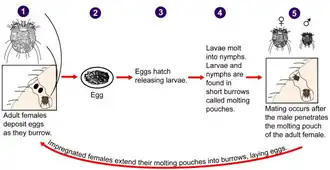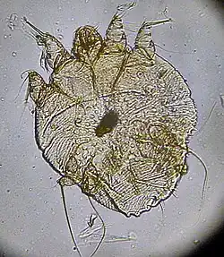 - ^ Arlian LG (1989). "Biology, host relations, and epidemiology of Sarcoptes scabiei". Annual Review of Entomology. 34 (1): 139–161. doi:10.1146/annurev.en.34.010189.001035. PMID 2494934.