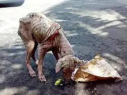 Scabies may occur in some domestic and wild animals; the mites that cause these infestations are of different subspecies from the one typically causing the human form.[22] These subspecies can infest animals that are not their usual hosts, but such infections do not last long.[22] Scabies-infected animals experience severe itching and secondary skin infections. They often lose weight and become frail.[29]