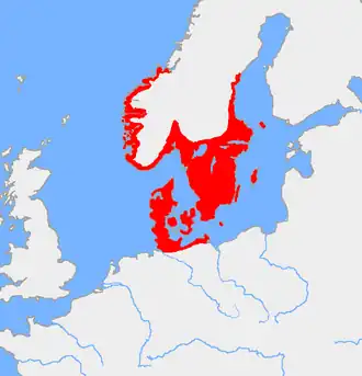 - Denmark, forged from the lands of Denmark (including Jutland, Zealand and Scania (Skåneland) on the Scandinavian Peninsula)[72]