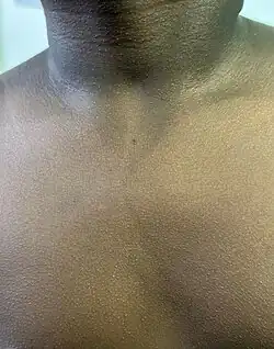 The characteristic rash has been denoted as "scarlatiniform", and it appears as a diffuse redness of the skin with small bumps resembling goose bumps.[17] It typically appears as small flat spots on the neck or torso before developing into small bumps that spread to the arms and legs.[18] It tends to feel rough like sandpaper.[19] The cheeks might look flushed with a pale area around the mouth.[1] The scarlet fever rash generally looks red on white and pale skin, and might be difficult to visualise on brown or black skin, in whom the bumps are typically larger, the skin looks like sandpaper, and the perioral pallor less obvious.[5] The palms and soles are spared.[18] The reddened skin blanches when pressure is applied to it.[5] The skin may feel itchy, but is not painful.[5] A more intense redness on the inside of skin folds and creases might be noticed.[4] These are lines of petechiae, appearing as pink/red areas located in arm pits and elbow pits.[18] It takes around a week for the main rash to disappear.[1] This may be followed by several weeks of peeling of the skin of typically fingers and toes.[1] The desquamation process usually begins on the face and progresses downward on the body.[5] Sometimes, this peeling is the only sign that scarlet fever occurred.[12] If the case of scarlet fever is uncomplicated, recovery from the fever and clinical symptoms, other than the process of desquamation, occurs in 5–10 days.[20] After the desquamation, the skin will be left with a sunburned appearance.[21]