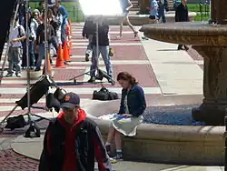 Johansson transitioned from teen to adult roles with two films in 2003: the romantic comedy-drama Lost in Translation and the drama Girl with a Pearl Earring.[38] In the former, directed by Sofia Coppola, she plays Charlotte, a listless and lonely young wife, opposite Bill Murray. Coppola had first noticed Johansson in Manny & Lo, and compared her to a young Lauren Bacall; Coppola based the film's story on the relationship between Bacall and Humphrey Bogart in The Big Sleep (1946).[39] Johansson found the experience of working with a female director different because of Coppola's ability to empathize with her.[40] Made on a budget of $4 million, the film grossed $119 million at the box office and received critical acclaim.[41][42] Roger Ebert was pleased with the film and described the lead actors' performances as "wonderful",[43] and Entertainment Weekly wrote of Johansson's "embracing, restful serenity".[44] The New York Times praised Johansson, aged 17 at the time of filming, for playing an older character.[45]