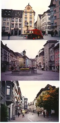 The largely pedestrianised old town has two preserved medieval gate towers and many fine Renaissance era buildings decorated with exterior frescos, sculptures and a total of 171 oriel windows (more than any other Swiss town).[2] The old canton fortress, the Munot, overlooks the old town. Schaffhausen railway station is a junction of Swiss and German railway lines. One of the lines connects the town with the nearby Rhine Falls in Neuhausen am Rheinfall, Europe's largest waterfall and a popular tourist attraction.