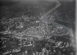 The Reformation was adopted, initially, in 1524 and completely in 1529. The town was heavily damaged during the Thirty Years' War by the passage of Swedish (Protestant) and Bavarian (Roman Catholic) troops and the very important bridge was burnt down. It was not until the early 19th century that the arrested industrial development of the town recommenced.[6] In 1857, the first railroad, the Rheinfallbahn, running from Winterthur, reached Schaffhausen.[8]