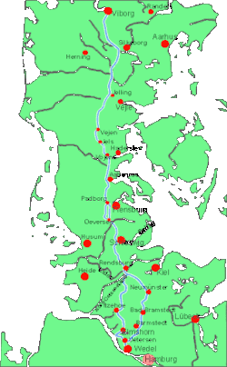 The Hærvejen, starting at its northern terminus in Viborg and reaching its southern terminus in Hamburg