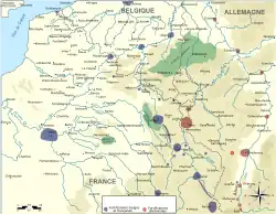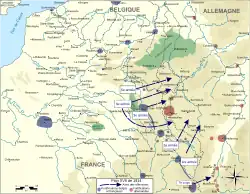 and that to achieve this, the French armies were to concentrate, ready to attack either side of Metz–Thionville or north into Belgium, in the direction of Arlon and Neufchâteau.[29] An alternative concentration area for the Fourth and Fifth armies was specified, in case the Germans advanced through Luxembourg and Belgium but an enveloping attack west of the Meuse was not anticipated. The gap between the Fifth Army and the North Sea was covered by Territorial units and obsolete fortresses.[30]