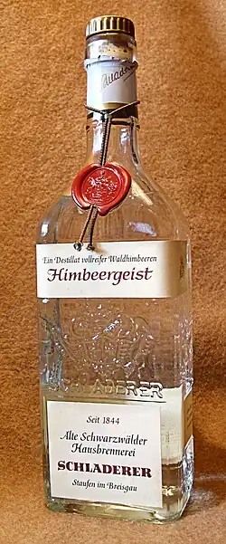 A Geist[8] (meaning "spirit" in German) is a type of schnapps, similar to fruit brandy, that is created by infusing macerated fresh berries in neutral spirits[9][10] and steeping for some time before distillation. Neutral alcohol is necessary because many berries have a sugar content that is too low to economically ferment and distill; raspberries, for instance, contain between 4.5 and 6.0% sugar.[9][11]