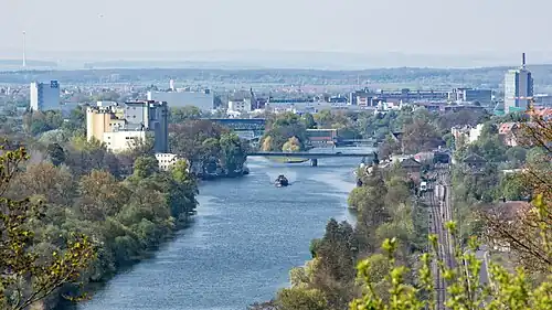 Most of the postwar construction projects were realized under the aegis of Mayor Georg Wichtermann (SPD, 1965–1974), in the city governed by the SPD by an absolute majority. Numerous new residential districts were created. By the Jump over the River Main (starting from 1963)[7] developed south of the Main River the commercial park Port East and the new industrial area Port West. The infrastructure was expanded, with the Main Port (1963) and today's University of Applied Sciences Würzburg-Schweinfurt (1971).