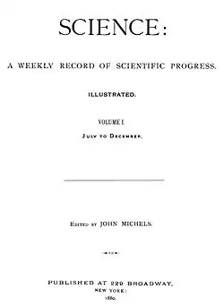 a weekly journal devoted mainly to physical science and invention, entitled Science, and Mr. [A. Graham] Bell purchased from Mr. John Michels for $5,000 the title and good will of this journal. Continuity of the publication was not, however, maintained, and the present journal [Science] dates from 1883. Mr. Thomas A. Edison had been responsible for the foundation of the earlier Science