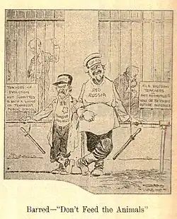 Tennessee State Representative John Washington Butler, a Tennessee farmer and head of the World Christian Fundamentals Association, lobbied state legislatures to pass anti-evolution laws. He introduced the Butler Act, which prohibited the teaching of human evolution in public schools in Tennessee.[15] Butler later stated, "I didn't know anything about evolution ... I'd read in the papers that boys and girls were coming home from school and telling their fathers and mothers that the Bible was all nonsense." On March 21, 1925, Tennessee governor Austin Peay signed the bill to gain support among rural legislators, but believed the law would neither be enforced nor interfere with education in Tennessee schools.[16] William Jennings Bryan, who had been campaigning against the teaching of evolution in public schools, thanked Peay enthusiastically for the bill, stating "The Christian parents of the state owe you a debt of gratitude for saving their children from the poisonous influence of an unproven hypothesis."[17] In response, the American Civil Liberties Union (ACLU) financed a test case by offering to defend anyone accused of teaching the theory of evolution in defiance of the Butler Act.[18]