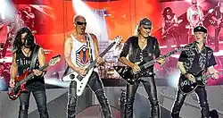 ![]() Scorpions in Melbourne, Australia in 2016 during the 50th Anniversary World Tour. (from left to right) Mikkey Dee, Matthias Jabs, Klaus Meine, Rudolf Schenker and Paweł Mąciwoda. | |