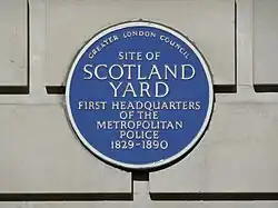 Scotland Yard (officially New Scotland Yard) is the headquarters of the Metropolitan Police, the territorial police force responsible for policing Greater London's 32 boroughs, and several additional authorities throughout the United Kingdom. Its name derives from the location of the original Metropolitan Police headquarters at 4 Whitehall Place, which had its main public entrance on the Westminster street called Great Scotland Yard.[1] The Scotland Yard entrance became the public entrance, and over time "Scotland Yard" came to be used not only as the common name of the headquarters building, but also as a metonym for the Metropolitan Police Service (MPS) itself and police officers, especially detectives, who serve in it.[2] The New York Times wrote in 1964 that, just as Wall Street gave its name to New York's financial district, Scotland Yard became the name for police activity in London.[3]