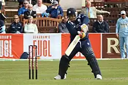 As well as hosting touring sides, Scotland frequently played English first-class counties in the post-war period, and took part in the Benson & Hedges Cup for the first time in 1980.[23] After enduring several winless seasons, their first Benson & Hedges victory came against Lancashire in 1986.[24] Their second win came in 1990 when they beat Northamptonshire, a match in which a 20-year-old Dougie Brown took three wickets.[25] When the tournament was reduced to the top eight County Championship teams for the 1999 season, they were unable to qualify and they did not rejoin the competition thereafter. In 1983, they took part in the NatWest Trophy. Their first win in the knockout competition came against Worcestershire in 1998. Gavin Haynes hit 74 and Man of the Match Craig Wright took 5/23 as Scotland sealed a famous four-run victory.[26]