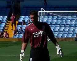 Carson returned to Liverpool at the end of the season and in June 2007, Liverpool manager Rafael Benítez confirmed that he would be part of the first-team squad for the 2007–08 season, saying "He must fight with Pepe Reina now for a starting place."[33] Carson remained second choice to Reina, however, and faced further competition following the signing of Charles Itandje in August 2007; as a result, Carson was loaned out again, this time to Aston Villa at a cost to Villa of £2 million. Benitez said of the deal, "We do not want to sell him, we are very happy with Scott. But he needs to play to keep up his England place."[36][37] Aston Villa manager Martin O'Neill preferred Carson to Thomas Sørensen and Stuart Taylor, and Carson played in all but three of Villa's 38 league matches, missing the two matches against Liverpool as he was ineligible to play,[37][38] and kept 11 clean sheets during the 2007–08 season.[39][40] He received the first red card of his career when he fouled Carlos Tevez in Villa's 4–1 Premier League defeat to Manchester United.[41]
