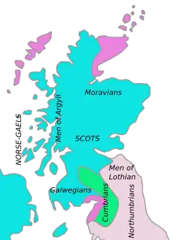Regardless of how it came to be spoken in the region, Gaelic in Scotland was mostly confined to Dál Riata until the eighth century, when it began expanding into Pictish areas north of the Firth of Forth and the Firth of Clyde. During the reign of Caustantín mac Áeda (Constantine II, 900–943), outsiders began to refer to the region as the kingdom of Alba rather than as the kingdom of the Picts. However, though the Pictish language did not disappear suddenly, a process of Gaelicisation (which may have begun generations earlier) was clearly under way during the reigns of Caustantín and his successors. By a certain point, probably during the 11th century, all the inhabitants of Alba had become fully Gaelicised Scots, and Pictish identity was forgotten.[25] Bilingualism in Pictish and Gaelic, prior to the former's extinction, led to the presence of Pictish loanwords in Scottish Gaelic[26] and syntactic influence[27] which could be considered to constitute a Pictish substrate.[28]