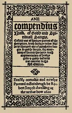 The Reformation had a severe impact on church music. The song schools of the abbeys, cathedrals and collegiate churches were closed down, choirs disbanded, music books and manuscripts destroyed and organs removed from churches.[92] The Lutheranism that influenced the early Scottish Reformation attempted to accommodate Catholic musical traditions into worship, drawing on Latin hymns and vernacular songs. The most important product of this tradition in Scotland was The Gude and Godlie Ballatis (1567), which were spiritual satires on popular ballads that have been commonly attributed to brothers James, John and Robert Wedderburn. Never adopted by the Kirk, they nevertheless remained popular and were reprinted from the 1540s to the 1620s.[101]