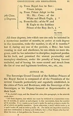 This long and lengthy process to obtain the degrees can be found within the foundational documents of the AASR, the Constitution and Regulation of 1762,[40] that is present on the altar of every Lodge in the Southern Jurisdiction. The foundational document proscribes the following minimum time allowed to receive the degrees: "All these degrees, into which one can only be initiated in a mysterious number of months, to arrive at each degree in due succession, make the number, in all, of 81 months. [41]