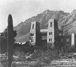 The Depression years saw an influx of artists and architects to Scottsdale, which included, in 1937, Frank Lloyd Wright. Wright and his wife purchased 600 acres (240 ha) acres of desert at the foot of the McDowell Mountains and established Taliesin West, his winter home and his architectural firm's southwestern headquarters.[11][14][23] Scottsdale and the rest of Phoenix have seen an everlasting influence from Wright. Many buildings throughout the region were designed by him. His influence on the regional architecture is commemorated by a major street bearing his name and a 125-foot (38 m) spire memorial designed by Wright in North Scottsdale.[24]