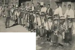 In 1920 three delegates, Toyomatsu Shimoda, Hiroshi Koshiba, and Richard Suzuki, attended the 1st World Scout Jamboree at Olympia, London. Shimoda and Koshiba were both adults and, when they met Richard Suzuki aboard ship and learned he was a Scout, they invited him to join. Richard was the son of a Japanese father and a British mother and was traveling to England for study. Richard was a member of the Yokohama international troop and, being the only Scout aged delegate, Richard carried the Japanese placard in the "Procession of the Nations" during the opening ceremonies.[5]