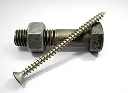 A wood screw is a metal screw used to fix wood, with a sharp point and a tapered thread designed to cut its own thread into the wood. Some screws are driven into intact wood; larger screws are usually driven into a hole narrower than the screw thread, and cut the thread in the wood. Early wood screws were made by hand, with a series of files, chisels, and other cutting tools, and these can be spotted easily by noting the irregular spacing and shape of the threads, as well as file marks remaining on the head of the screw and in the area between threads. Many of these screws had a blunt end, completely lacking the sharp tapered point on nearly all modern wood screws.[30] Some wood screws were made with cutting dies as early as the late 1700s (possibly even before 1678 when the book content was first published in parts).[31] Eventually, lathes were used to manufacture wood screws, with the earliest patent being recorded in 1760 in England.[30] During the 1850s, swaging tools were developed to provide a more uniform and consistent thread. Screws made with these tools have rounded valleys with sharp and rough threads.[32][33]