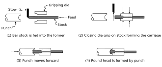 There are three steps in manufacturing a screw: heading, thread rolling, and coating. Screws are normally made from wire, which is supplied in large coils, or round bar stock for larger screws. The wire or rod is then cut to the proper length for the type of screw being made; this workpiece is known as a blank. It is then cold headed, which is a cold working process. Heading produces the head of the screw. The shape of the die in the machine dictates what features are pressed into the screw head; for example a flat head screw uses a flat die. For more complicated shapes two heading processes are required to get all of the features into the screw head. This production method is used because heading has a very high production rate, and produces virtually no waste material. Slotted head screws require an extra step to cut the slot in the head; this is done on a slotting machine. These machines are essentially stripped down milling machines designed to process as many blanks as possible.