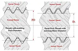 As shown in the figure at right, threads of equal pitch and angle that have matching minor diameters, with differing major and pitch diameters, may appear to fit snugly, but only do so radially; threads that have only major diameters matching (not shown) could also be visualized as not allowing radial movement. The reduced material condition, due to the unused spaces between the threads, must be minimized so as not to overly weaken the fasteners.