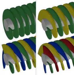 A screw thread is a helical structure used to convert between rotational and linear movement or force. A screw thread is a ridge wrapped around a cylinder or cone in the form of a helix, with the former being called a straight thread and the latter called a tapered thread. A screw thread is the essential feature of the screw as a simple machine and also as a threaded fastener.
