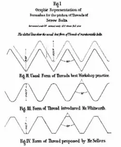 In 1841, Joseph Whitworth created a design that, through its adoption by many British railway companies, became a standard for the United Kingdom and British Empire called British Standard Whitworth. During the 1840s through 1860s, this standard was often used in the United States as well, in addition to myriad intra- and inter-company standards. In April 1864, William Sellers presented a paper to the Franklin Institute in Philadelphia, proposing a new standard to replace the US' poorly standardized screw thread practice. Sellers simplified the Whitworth design by adopting a thread profile of 60° and a flattened tip (in contrast to Whitworth's 55° angle and rounded tip).[16][17] The 60° angle was already in common use in America,[18] but Sellers's system promised to make it and all other details of thread form consistent.