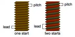Because the vast majority of screw threadforms are single-start threadforms, their lead and pitch are the same. Single-start means that there is only one "ridge" wrapped around the cylinder of the screw's body. Each time that the screw's body rotates one turn (360°), it has advanced axially by the width of one ridge. "Double-start" means that there are two "ridges" wrapped around the cylinder of the screw's body.[4] Each time that the screw's body rotates one turn (360°), it has advanced axially by the width of two ridges. Another way to express this is that lead and pitch are parametrically related, and the parameter that relates them, the number of starts, very often has a value of 1, in which case their relationship becomes equality. In general, lead is equal to pitch times the number of starts.