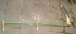 There is an international scything competition held at Goričko[17] where people from Austria, Hungary, Serbia and Romania, or as far away as Asia, enter to showcase their culturally unique method of reaping crops.[18] In 2009, a Japanese man showcased a wooden reaping tool with a metal edge, which he used to show how rice was cut. He was impressed with the speed of the local reapers, but said such a large scythe would never work in Japan.