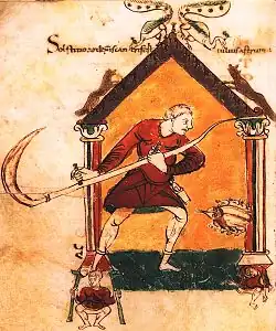 The word "scythe" derives from Old English siðe.[1] In Middle English and later, it was usually spelled sithe or sythe. However, in the 15th century some writers began to use the sc- spelling as they thought (wrongly) that the word was related to the Latin scindere (meaning "to cut").[2] Nevertheless, the sithe spelling lingered, and notably appears in Noah Webster's dictionaries.[3][4]