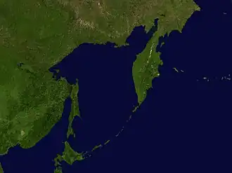 The Sea of Okhotsk[a] is a marginal sea of the northwestern Pacific Ocean.[1] It is located between Russia's Kamchatka Peninsula on the east, the Kuril Islands on the southeast, Japan's island of Hokkaido on the south, the island of Sakhalin along the west, and a stretch of eastern Siberian coast along the west and north. Its northeast corner is the Shelikhov Gulf. The sea is named for the port of Okhotsk, itself named for the Okhota River.[2]