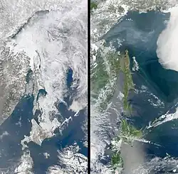 In winter, navigation on the Sea of Okhotsk is impeded by ice floes.[5] Ice floes form due to the large amount of freshwater from the Amur River, lowering the salinity of upper levels, often raising the freezing point of the sea surface. The distribution and thickness of ice floes depend on many factors: the location, the time of year, water currents, and the sea temperatures.[6]