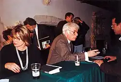 Heaney was awarded the Nobel Prize in Literature in 1995 for "works of lyrical beauty and ethical depth, which exalt everyday miracles and the living past".[47] He was on holiday in Greece with his wife when the news broke. Neither journalists nor his own children could reach him until he arrived at Dublin Airport two days later, although an Irish television camera traced him to Kalamata. Asked how he felt to have his name added to the Irish Nobel pantheon of W. B. Yeats, George Bernard Shaw and Samuel Beckett, Heaney responded: "It's like being a little foothill at the bottom of a mountain range. You hope you just live up to it. It's extraordinary."[48] He and his wife Marie were immediately taken from the airport to Áras an Uachtaráin for champagne with President Mary Robinson.[48] He would refer to the prize discreetly as "the N thing" in personal exchanges with others.[49]
