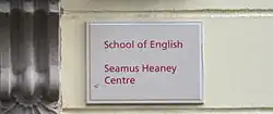 In 2003 the Seamus Heaney Centre for Poetry was opened at Queen's University Belfast. It houses the Heaney Media Archive, a record of Heaney's entire oeuvre, along with a full catalogue of his radio and television presentations.[56] That same year, Heaney decided to lodge a substantial portion of his literary archive at Emory University as a memorial to the work of William M. Chace, the university's recently retired president.[57][58] The Emory papers represented the largest repository of Heaney's work (1964–2003). He donated these to help build their large existing archive of material from Irish writers including Yeats, Paul Muldoon, Ciaran Carson, Michael Longley and other members of the Belfast Group.[59]