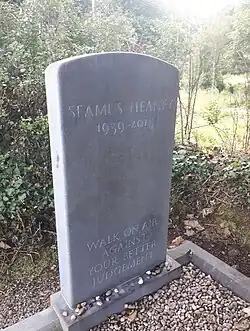 Heaney is buried at St. Mary's Church, Bellaghy, Northern Ireland. The headstone bears the epitaph "Walk on air against your better judgement", from his poem "The Gravel Walks".[8]