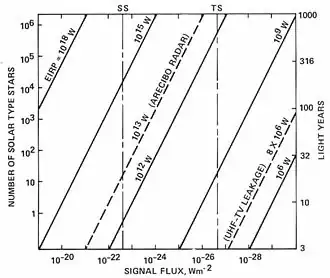 Since 2016, University of California Los Angeles (UCLA) undergraduate and graduate students have been participating in radio searches for technosignatures with the Green Bank Telescope. Targets include the Kepler field, TRAPPIST-1, and solar-type stars.[69] The search is sensitive to Arecibo-class transmitters located within 420 light years of Earth and to transmitters that are 1,000 times more powerful than Arecibo located within 13,000 light years of Earth.[70]