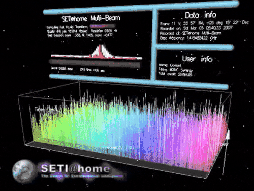 SETI@home was conceived by David Gedye along with Craig Kasnoff and is a popular volunteer computing project that was launched by the Berkeley SETI Research Center at the University of California, Berkeley, in May 1999. It was originally funded by The Planetary Society and Paramount Pictures, and later by the state of California. The project is run by director David P. Anderson and chief scientist Dan Werthimer. Any individual could become involved with SETI research by downloading the Berkeley Open Infrastructure for Network Computing (BOINC) software program, attaching to the SETI@home project, and allowing the program to run as a background process that uses idle computer power. The SETI@home program itself ran signal analysis on a "work unit" of data recorded from the central 2.5 MHz wide band of the SERENDIP IV instrument. After computation on the work unit was complete, the results were then automatically reported back to SETI@home servers at University of California, Berkeley. By June 28, 2009, the SETI@home project had over 180,000 active participants volunteering a total of over 290,000 computers. These computers gave SETI@home an average computational power of 617 teraFLOPS.[71] In 2004 radio source SHGb02+14a set off speculation in the media that a signal had been detected but researchers noted the frequency drifted rapidly and the detection on three SETI@home computers fell within random chance.[72][73]