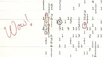 The Ohio State SETI program gained fame on August 15, 1977, when Jerry Ehman, a project volunteer, witnessed a startlingly strong signal received by the telescope. He quickly circled the indication on a printout and scribbled the exclamation "Wow!" in the margin. Dubbed the Wow! signal, it is considered by some to be the best candidate for a radio signal from an artificial, extraterrestrial source ever discovered, but it has not been detected again in several additional searches.[20]
